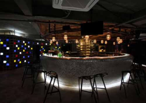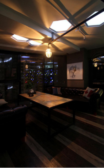 內(nèi)部功能主要有中心吧臺區(qū),卡座區(qū),影視吧,辦公室,廚房。整個空間的中心是橢圓型的吧臺,其他功能規(guī)劃都圍繞中心吧臺展開,動線也圍繞吧臺展開,吧臺的材質(zhì)用的是不銹鋼馬賽克,磨砂和亮光交錯,在燈光的照射下,形成流動的光斑。吧臺的中心有一個承重柱,巧妙用螺紋鋼做了一個放紅酒的酒架。酒架上彎之后與頂上的酒架相連,與裸露的梁體 消防管道和吧臺頂上鐵件的酒架,形成頂面簡潔富有線性的頂面結(jié)構(gòu)。