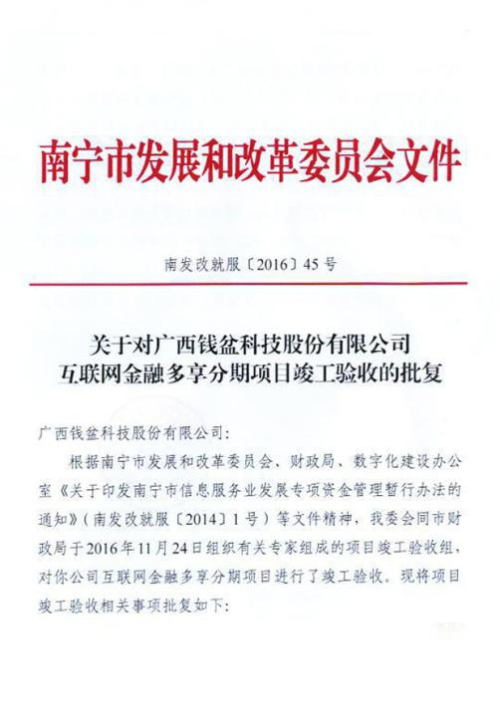 據(jù)悉,2016年12月31日,錢盆網(wǎng)多享分期項(xiàng)目通過了廣西南寧市發(fā)展和改革委員會(huì)的專項(xiàng)資金審批,獲得近百萬元的資金支持。且在此次的獲批企業(yè)中,包括高新科技、精英突出企業(yè)共18家,而錢盆網(wǎng)是唯一一家互聯(lián)網(wǎng)金融平臺(tái)。