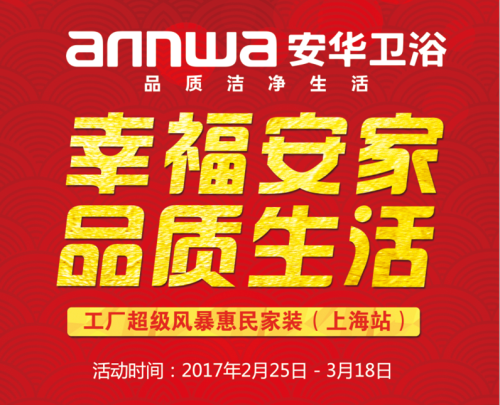 伴隨著新一年春節(jié)過后的余溫,新一輪家裝熱潮蓄勢待發(fā),2017年2月25日,安華衛(wèi)浴工廠總部在上海吹響了促銷活動的號角,此次主題為“幸福安家 品質生活”的3.18惠民家裝活動,是安華工廠在上海舉辦的大型讓利促銷活動。本次活動由安華衛(wèi)浴總部全盤策劃,直達上海全面讓利,以頂級的品質,實惠的價格感恩回饋千千萬萬的上海業(yè)主,讓所有消費者買的放心、用的舒心。