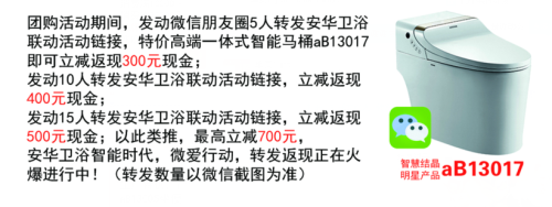 二、【智能時代,微信轉發(fā)返現(xiàn)】 安華衛(wèi)浴上海聯(lián)動工廠大補貼,感恩回饋廣大業(yè)主,以最實惠的價格,頂級的品質讓利廣大的業(yè)主朋友們。
