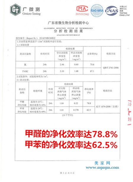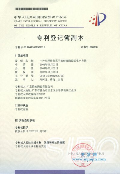 權(quán)威證明,特地負(fù)離子瓷磚能夠有效分解室內(nèi)污染源(家具、板材、油漆、粘膠等)不斷釋放出游離的甲醛、氨、苯等有害氣體。氨的去除率達(dá)75.6%,TVOC的去除率達(dá)67.1%,甲醛的凈化效率達(dá)78.8%,甲苯的凈化效率達(dá)62.5%。