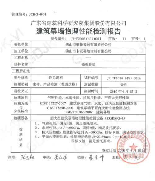 近日,唯格2cm瓷板通過國標(biāo)《建筑幕墻》GB/T 21086-2007最高級別檢測,由廣東省建筑科學(xué)研究院檢測鑒定。其中,氣密性能為國標(biāo)4級;水密性能為國標(biāo)5級;抗風(fēng)壓性能指標(biāo)達(dá)到P3 =5000Pa,國標(biāo)9級;平面內(nèi)變形性能為國標(biāo)5級,在試驗(yàn)過程中未出現(xiàn)滲漏、無功能障礙或損害發(fā)生。