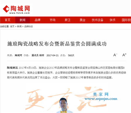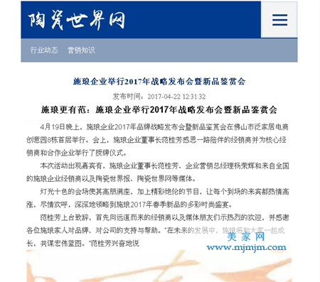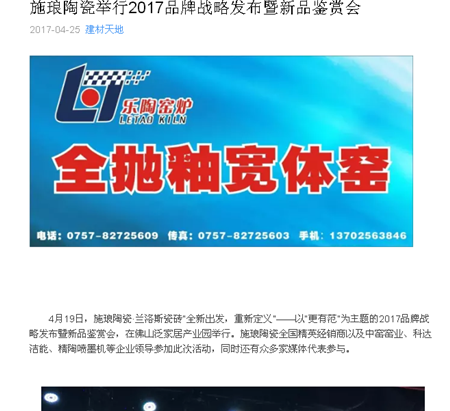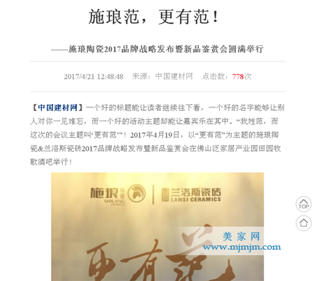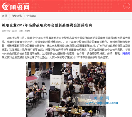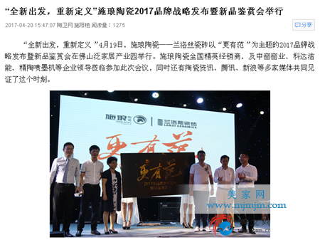 2017年4月19日,施瑯企業(yè)2017年品牌戰(zhàn)略發(fā)布會暨新品鑒賞會在佛山市泛家居電商創(chuàng)意園8棟首層盛大舉行。施瑯企業(yè)旗下施瑯陶瓷和蘭斯瓷磚兩大人氣品牌齊亮相,瞬間點燃現(xiàn)場激情!