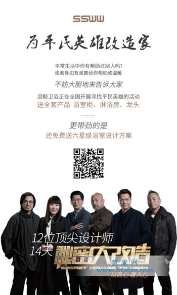 在我們身邊,像這樣的平凡英雄不計其數(shù),浪鯨衛(wèi)浴不光為節(jié)目中的12位英雄改造衛(wèi)浴空間,我們希望讓身邊更多的英雄得到衛(wèi)浴空間體驗,平常生活中你有幫助過別人嗎?或者印象中身邊有誰曾給過你幫助或溫暖?不妨大膽地來告訴大家!浪鯨衛(wèi)浴正在全國開展尋找平民英雄的活動,如果您有幸被選上,浪鯨送您全套產(chǎn)品  浴室柜、淋浴房、龍頭…….更帶勁的是  還免費送六星級浴室設計方案如此豪禮,還不趕快參加??請掃二維碼,快速進入報名通道,請把您或您身英雄的故事告訴我們~