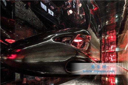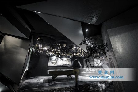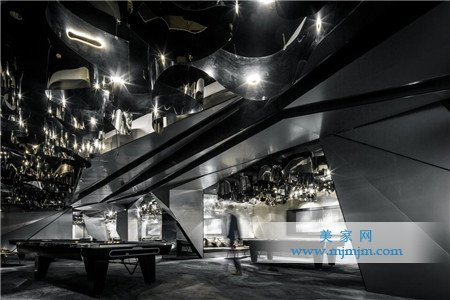 Song's Club想營造一個由時間維度構(gòu)成的由混沌到未來的意象的場所,混沌與未來中間夾雜對體驗的印象寫照。我們順著這些體驗的記憶創(chuàng)造隔而不斷的“山墻”,圍和而又穿透的“山墻”構(gòu)成了空間。人們根據(jù)活動私密與開發(fā)賦予空間不同的屬性,使之聯(lián)動、各自滲透,使得邊界模糊,“山墻”的間隙大小使得空間有著不同情態(tài)得變化。有隱秘的,有豁然開朗的。許多線性垂直相交的裝置構(gòu)筑成“疊加的墻體”。在燈光的作用下,透著斑斕的光影。在這些界面中如自然的樹影婆娑!粗糙的材料與光滑的金屬貫穿不同的元素。使原始與未來的因素在同一個空間發(fā)生趣味的碰撞。