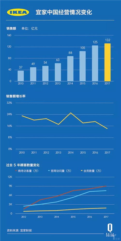 高速增長的中國市場是宜家高度依賴的對象,但2017財年它在這個市場的銷售額、商場訪客數量、官網訪問量、會員數量的增幅相比上一個財年分別下降了4.9%、9%、10%和9%。