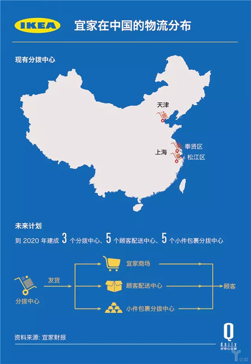 唯一與“多渠道零售”相關的,是兩個與內部體系相關的新變化。宜家打算在2020年前在中國建成3個分撥中心、5個顧客配送中心、5個小件包裹分撥中心。它們將分布在東南西北中五個區(qū)域,以實現物流提速。