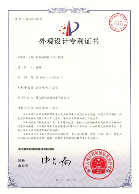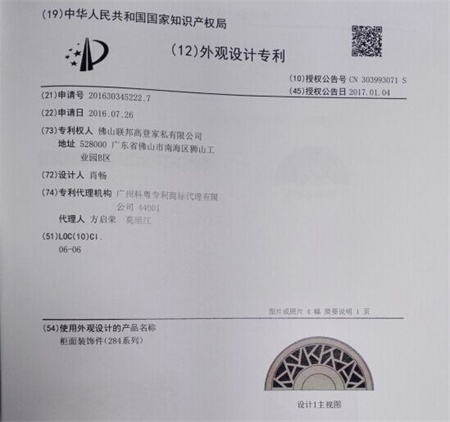 外觀設(shè)計專利(Industrial Design)是指對產(chǎn)品的形狀、圖案或其結(jié)合以及色彩與形狀、圖案的結(jié)合所做出的富有美感并適于工業(yè)應用的新設(shè)計。聯(lián)邦高登全屋定制新中式系列產(chǎn)品憑借典雅的配色與飾面一經(jīng)問世便大受歡迎。其中極具東方韻味的柜面裝飾件自2016年發(fā)布,便擁有外觀設(shè)計專利,受我國《專利法》保護。