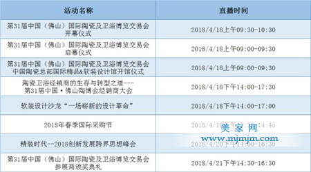 第31屆佛山陶博會開幕式、第31屆佛山陶博會經(jīng)銷商大會、精裝時代--2018創(chuàng)新發(fā)展跨界思想峰會等活動現(xiàn)場直播,不管你在不在活動現(xiàn)場都能看到不容錯過的精彩。