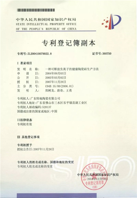 2004年特地攜手中山大學共同研發(fā)出首片負離子瓷磚