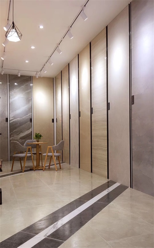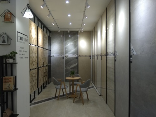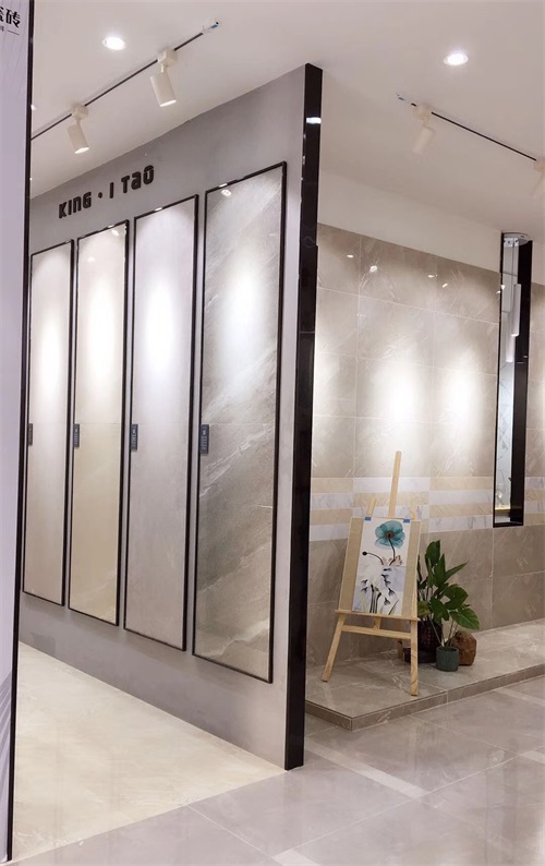 這是緞光釉卡拉卡白鋪貼的形象墻,白色的基調讓空間看起來寬敞明亮,灰色大紋理散發(fā)著優(yōu)雅的氣息。