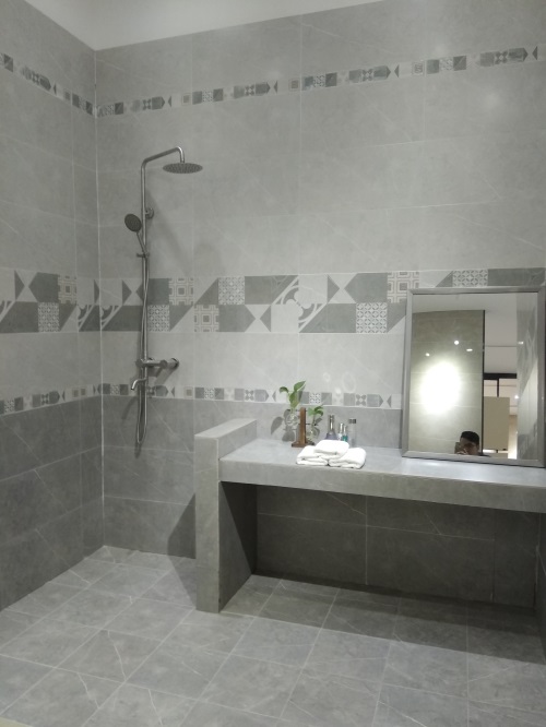 這是緞光釉鋪貼的衛(wèi)生間模擬間,衛(wèi)生間講究私密性,設計師一般考慮使用深色磚,緞光釉防滑度高,非常適合廚衛(wèi)、陽臺地磚墻磚使用。