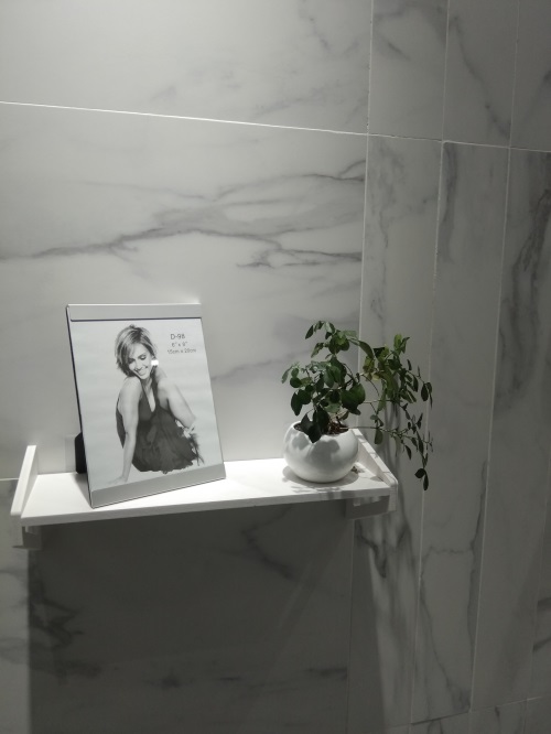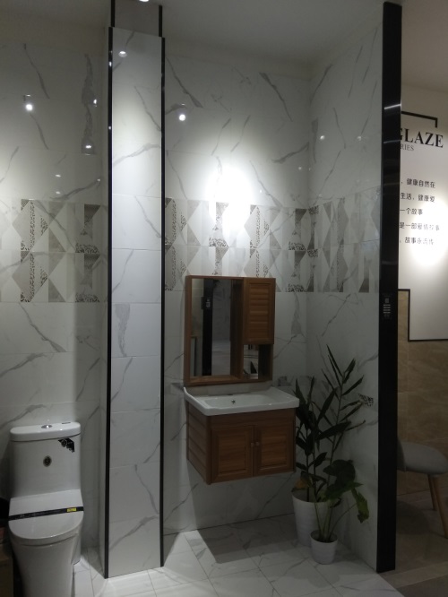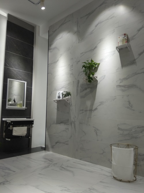 這是金艾陶新款的廚衛(wèi)噴墨瓷片,卡拉卡白元素的瓷片優(yōu)雅,非常適合現(xiàn)代風和輕奢風的裝修。