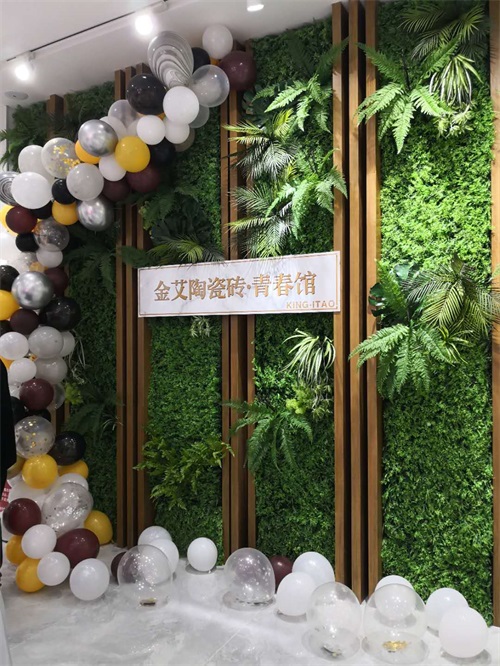 這是金艾陶云南保山青春館的形象臺(tái)和形象墻,上圖由灰色九面通體大理石鋪貼的前臺(tái)背景墻,可作電視背景墻和客廳地磚鋪貼使用,下圖是由綠植拼接的品牌形象墻,散發(fā)出勃勃的生機(jī)。