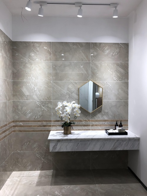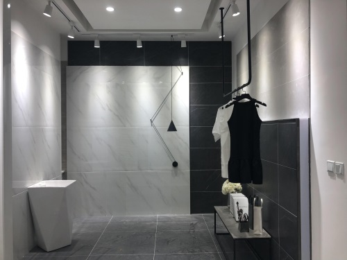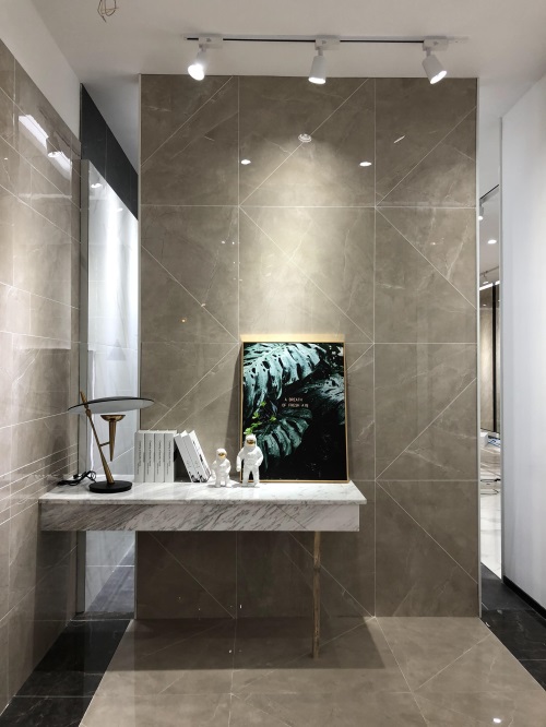 這是灰色調(diào)的衛(wèi)生間模擬間,瓷磚選用通體大理石亮面磚,上墻下地都能鋪,現(xiàn)代簡(jiǎn)約風(fēng)和輕奢風(fēng)都十分適用。