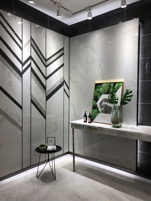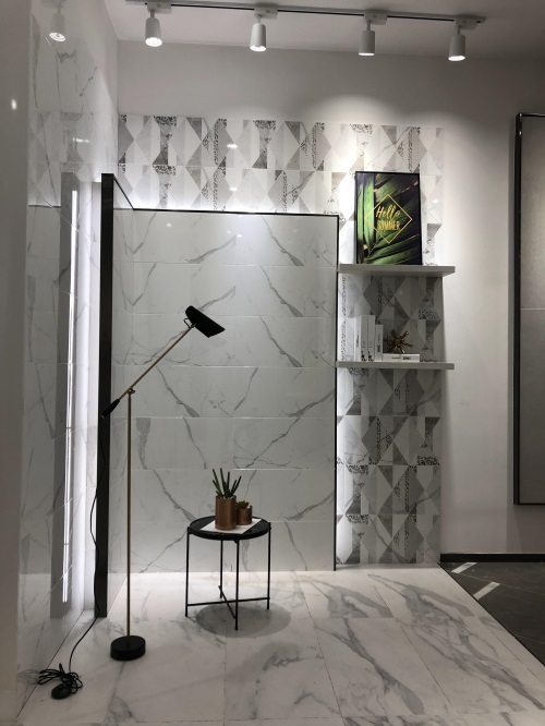 這是吧臺(tái)模擬間,由九面通體大理石和緞光釉不同規(guī)格、產(chǎn)品、顏色鋪貼的墻面,個(gè)性、時(shí)尚,搭配大理石吧臺(tái)和金屬軟裝,營(yíng)造出輕奢的質(zhì)感。
