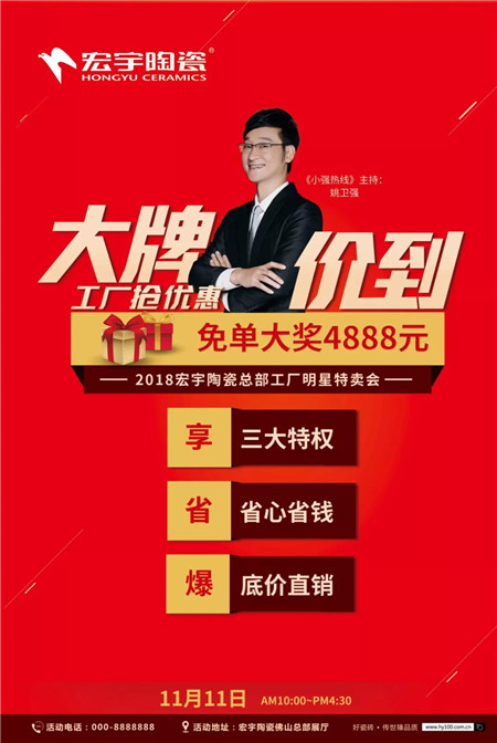 11月11日,“大牌價(jià)到!工廠搶優(yōu)惠!——2018宏宇陶瓷總部工廠明星特賣會(huì)”將隆重開啟,屆時(shí)將有佛山知名主持小強(qiáng)傾力助陣,邀您購(gòu)明星產(chǎn)品贏終極大獎(jiǎng),體驗(yàn)有溫度的家居生活!