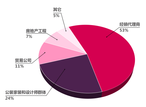 本屆展會(huì),共接待國(guó)內(nèi)觀眾169026人次,超過(guò)74%的買(mǎi)家通過(guò)線上平臺(tái)進(jìn)行了電子門(mén)票的預(yù)登記入場(chǎng)。從買(mǎi)家行業(yè)屬性上看,經(jīng)銷(xiāo)代理商依然是最大的買(mǎi)家群體,占比53%,比31屆下滑了5%,而公裝家裝和設(shè)計(jì)師群體占比為24%;貿(mào)易公司占比為10.6%,與上一屆基本持平;房地產(chǎn)工程占比7.4%,整體上升了5.4%,這也凸顯了32屆佛山陶博會(huì)工程產(chǎn)品館的效能和影響力;整裝、房地產(chǎn)行業(yè)的比例近幾年增加迅速,這類(lèi)渠道將成為未來(lái)陶瓷衛(wèi)浴企業(yè)開(kāi)拓市場(chǎng)主要的營(yíng)銷(xiāo)渠道。