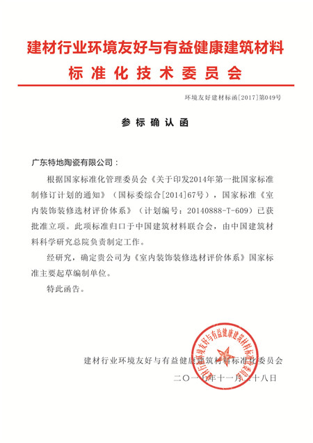 僅以特地為例,中國建筑材料聯合會正在擬定中的《室內裝飾裝修選材評價體系》 國家標準,在知悉特地·負離子瓷磚的創(chuàng)新技術后,該國家標準編制委員會正式確定將廣東特地陶瓷有限公司納入起草人單位。此前,起草人單位中包括廣田股份、深裝總、亞廈裝飾等裝修行業(yè)巨頭以及多家綠色、環(huán)保、節(jié)能的材料企業(yè)。