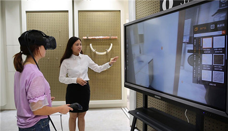 完成設(shè)計(jì)之后,我們可以到智慧門(mén)店的VR體驗(yàn)區(qū)。借助融入了歐神諾720°DIY換磚系統(tǒng)的VR體驗(yàn)平臺(tái),設(shè)計(jì)師可以將已經(jīng)設(shè)計(jì)好的方案導(dǎo)入VR平臺(tái),隨后我們就可以身臨其境,逼真體驗(yàn)全屋情景VR漫游,同時(shí)也能在VR漫游的過(guò)程中體驗(yàn)720°隨手DIY換磚的便捷服務(wù)。