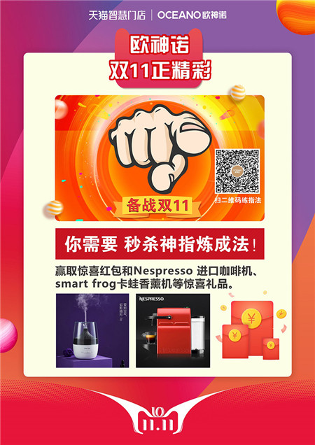 臨近雙11,相信大家都進(jìn)入了瘋搶熱身狀態(tài),今天除了歐神諾智慧門(mén)店體驗(yàn),小編還給大家?guī)?lái)了一套歐神諾“秒殺神指煉成法”。通過(guò)幾重考驗(yàn),除了鍛煉你的手指,還有機(jī)會(huì)贏(yíng)取Nespresso 進(jìn)口咖啡機(jī)、smart frog卡蛙香薰機(jī)等驚喜禮品。中獎(jiǎng)信息將在活動(dòng)結(jié)束后公布于歐神諾官方公眾號(hào)頭條,關(guān)注歐神諾官微,更多雙11驚喜活動(dòng)等你參與!