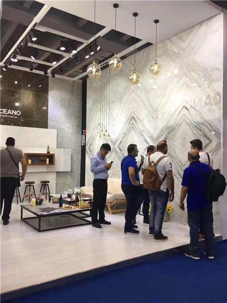 在此次廣交會上,陶瓷大板是歐神諾品牌新品展示的重點。作為佛山代表性陶瓷企業(yè),歐神諾帶來了卡薩羅系列卡莫大板產(chǎn)品,現(xiàn)場用抽象的圖案拼接配合卡莫大板打造開放式客廳和吧臺,展廳整體風格典雅、簡約、大氣,熱情西班牙風格的環(huán)境搭配西班牙美酒佳肴,使得歐神諾展位成為眾多境外采購商關注的焦點。中東、北美的采購商拿著手機拍好的照片直奔歐神諾展位,不一會功夫,便簽下了年度訂單。