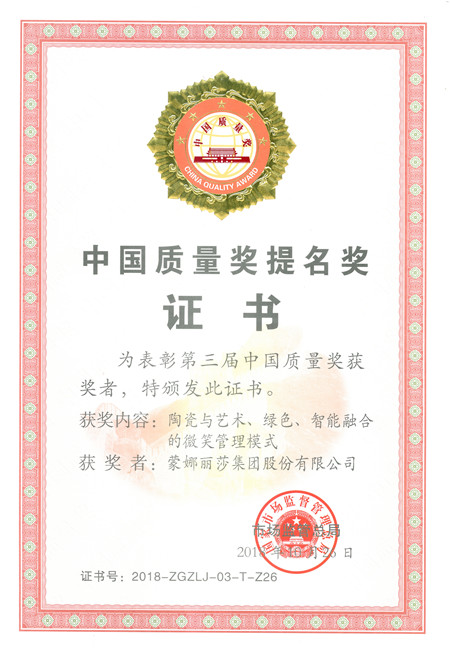 蒙娜麗莎獲第三屆中國(guó)質(zhì)量獎(jiǎng)提名獎(jiǎng)
