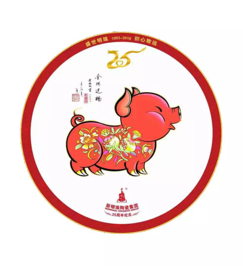 這只歡樂豬代表新明珠事業(yè)紅紅火火,寓意財源滾滾;石榴象征著多子多福、萬子同心,寓意新明珠人同心同德,牡丹與石榴的結(jié)合組成民間吉祥紋樣中的“富貴滿堂”與“興旺昌盛”;