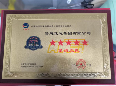 在中國物流與采購聯(lián)合會(huì)公路貨運(yùn)分會(huì)主辦的第二批“中國公路貨運(yùn)星級車隊(duì)評選”活動(dòng)中,跨越榮獲中國公路貨運(yùn)五星級車隊(duì)獎(jiǎng)。