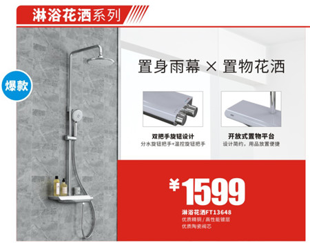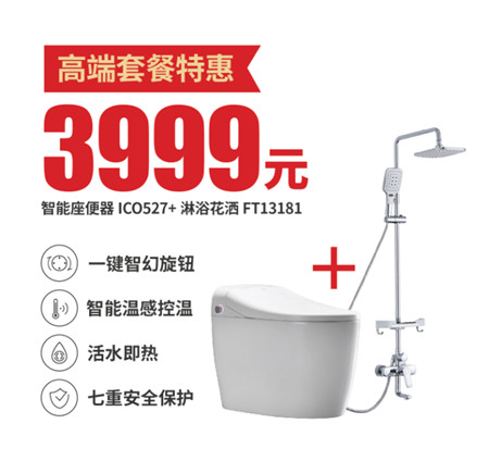 據(jù)悉,高端特惠套餐最為吸引消費(fèi)者,智能座便器ICO527+淋浴花灑 FT13181高端套餐特惠僅售3999元!FT13648的多功能淋浴花灑同樣以1599元特惠價(jià)回饋消費(fèi)者。還有多款整體浴室柜、智能馬桶、淋浴房、浴缸等精品衛(wèi)浴等您到店搶購!
