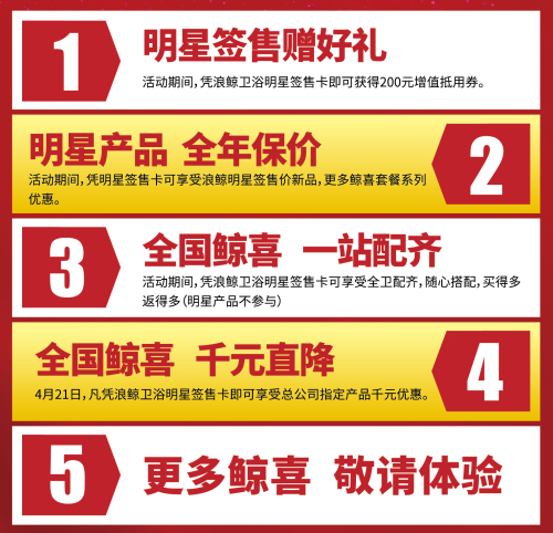 福利二:活動期間,憑浪鯨衛(wèi)浴明星簽售卡可享受浪鯨明星簽售價新品,更多鯨喜套餐系列優(yōu)惠;
