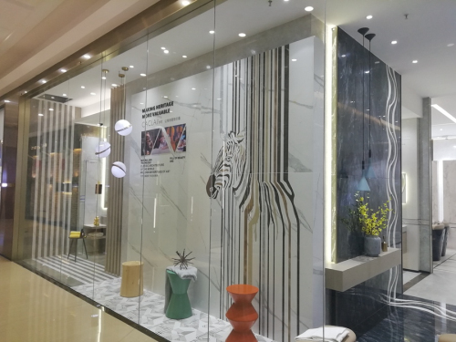 在展廳側(cè)面,以時裝櫥柜展示著1200×2400mm的大板,宏偉大氣,大版面上利用不同顏色的瓷磚拼花拼出的一頭斑馬,成為整個櫥柜的亮睛之筆。