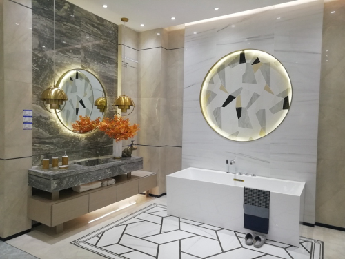 選材區(qū)的設(shè)計,不僅要很好地展示產(chǎn)品外,還要讓選材者在選材的過程中不覺得乏味。在唐山的CASARA國際風(fēng)尚館中,設(shè)計師巧妙地在地面的瓷磚鋪貼上增添了各種拼花鋪貼,以及設(shè)計了如同屏風(fēng)般的瓷磚展板,讓整個選材區(qū)不再單調(diào),極具設(shè)計美學(xué)。