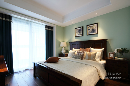 主臥使用原木色地板作為高雅空間氛圍的營造。富有戶外森林氣息的墻頭畫、木質(zhì)床、美式風(fēng)格吊燈、深綠色窗簾等可以看出業(yè)主的高端品位。床上用品更是體現(xiàn)出對舒適高雅生活的追求。