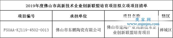 佛山市科學(xué)技術(shù)局于9月24日對2019年度高新技術(shù)企業(yè)創(chuàng)新聯(lián)盟培育項(xiàng)目擬立項(xiàng)方案予以公示。2019年度高新技術(shù)企業(yè)創(chuàng)新聯(lián)盟培育項(xiàng)目擬立項(xiàng)方案共有8個(gè)項(xiàng)目,其中,佛山市東鵬陶瓷有限公司作為承擔(dān)單位的“佛山市建陶產(chǎn)業(yè)高新技術(shù)企業(yè)創(chuàng)新聯(lián)盟培育項(xiàng)目”入選。