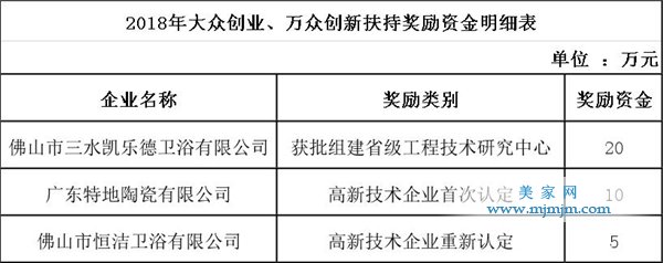 其中,佛山市三水凱樂德衛(wèi)浴有限公司、廣東特地陶瓷有限公司、佛山市恒潔衛(wèi)浴有限公司等3家陶瓷、衛(wèi)浴企業(yè)獲得獎勵資金,共計35萬元。