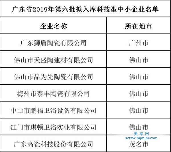 廣東省2019年第六批擬入庫科技型中小企業(yè)中,廣東獅盾陶瓷有限公司、佛山市天盛陶建材有限公司、佛山市品為先陶瓷有限公司等7家陶瓷、衛(wèi)浴企業(yè)入選。