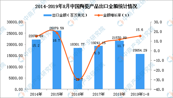 從金額方面來看,2019年1-8月中國陶瓷產(chǎn)品出口金額為15654.29百萬美元,同比增長15.6%。