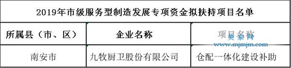 泉州市2019年市級(jí)服務(wù)型制造發(fā)展專項(xiàng)資金擬扶持項(xiàng)目共有40項(xiàng)。其中,九牧廚衛(wèi)股份有限公司的“倉配一體化建設(shè)”項(xiàng)目入選。
