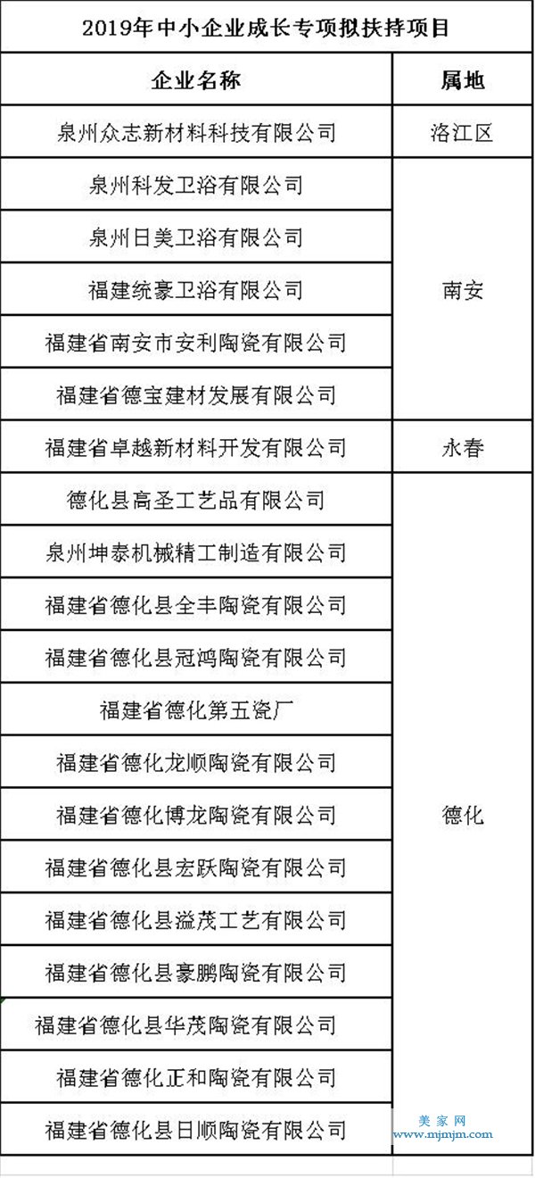 泉州市2019年中小企業(yè)成長專項(xiàng)資金擬扶持項(xiàng)目共有129項(xiàng)。其中,福建統(tǒng)豪衛(wèi)浴有限公司、福建省德化縣冠鴻陶瓷有限公司、福建省德化正和陶瓷有限公司等20家陶瓷、衛(wèi)浴企業(yè)入選。