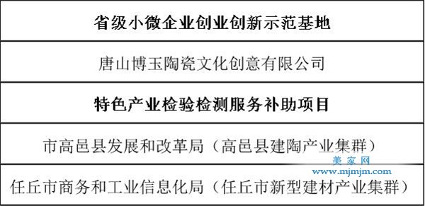 其中,唐山博玉陶瓷文化創(chuàng)意有限公司擬入選省級小微企業(yè)創(chuàng)業(yè)創(chuàng)新示范基地。高邑縣建陶產(chǎn)業(yè)集群、任丘市新型建材產(chǎn)業(yè)集群擬入選特色產(chǎn)業(yè)檢驗檢測服務(wù)補(bǔ)助項目。