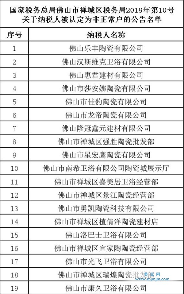 其中,有19家陶瓷、衛(wèi)浴企業(yè)被禪城區(qū)稅務(wù)局認(rèn)定為非正常戶。