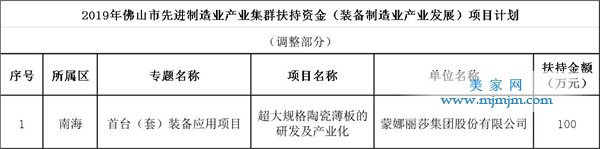 其中,蒙娜麗莎集團的“超大規(guī)格陶瓷薄板的研發(fā)及產(chǎn)業(yè)化”項目所獲扶持金額調(diào)整為100萬元。