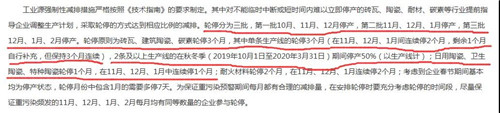 輪停原則為磚瓦、建筑陶瓷、碳素輪停3個月,其中單條生產(chǎn)線的輪停3個月(在11月、12月、1月間連續(xù)停2個月,剩余1個月自行補充,但保持3個月連續(xù)),2條及以上生產(chǎn)線的在秋冬季(2019年10月1日至2020年3月31日)期間停產(chǎn)50%(以生產(chǎn)線計);