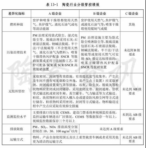 此前,環(huán)保部發(fā)布的《重污染天氣重點行業(yè)應(yīng)急減排措施制定技術(shù)指南》中提出,將通過燃料種類、污染治理技術(shù)、無組織管控、監(jiān)測監(jiān)控水平、排放限值、運輸方式等差異化指標(biāo)將陶瓷行業(yè)企業(yè)分為A、B、C三級,實行分級管控。