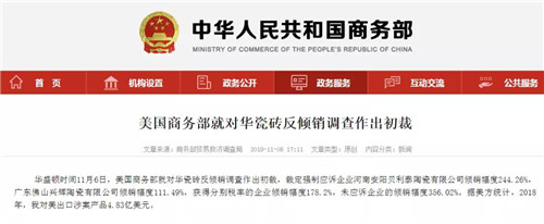 商務部11月8日消息,華盛頓時間11月6日,美國商務部就對華瓷磚反傾銷調(diào)查作出初裁。
