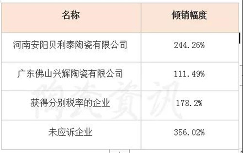 美國商務部裁定強制應訴企業(yè)河南安陽貝利泰陶瓷有限公司傾銷幅度244.26%,廣東佛山興輝陶瓷有限公司傾銷幅度111.49%,獲得分別稅率的企業(yè)傾銷幅度178.2%,未應訴企業(yè)的傾銷幅度356.02%。