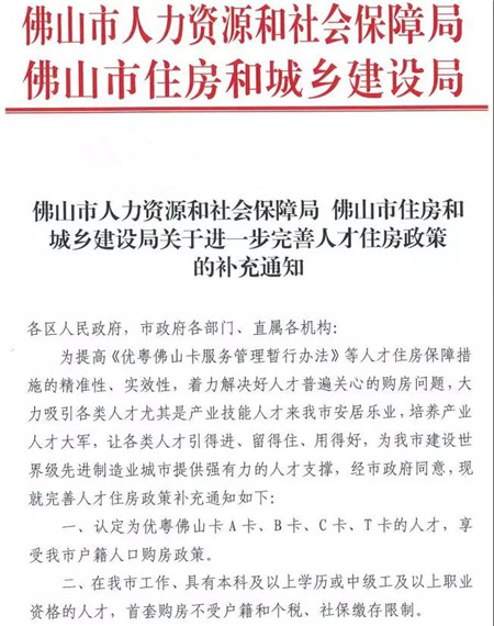 昨天的《補充通知》指出,此舉意在提高《優(yōu)粵佛山卡服務(wù)管理暫行辦法》等人才住房保障措施的精準性、實效性,著力解決好人才普遍關(guān)心的購房問題,大力吸引各類人才尤其是產(chǎn)業(yè)技能人才來佛山安居樂業(yè),培養(yǎng)產(chǎn)業(yè)人才大軍,讓各類人才引得進、留得住、用得好,為佛山建設(shè)世界級先進制造業(yè)城市提供強有力的人才支撐。