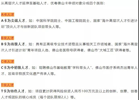 一是認定為優(yōu)粵佛山卡A卡、B卡、C卡、T卡的人才,享受佛山市戶籍人口購房政策;