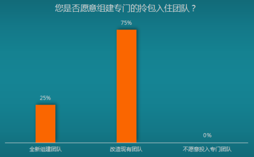 調(diào)查發(fā)現(xiàn),有45%的經(jīng)銷商群體所在企業(yè)擁有拎包入住專項(xiàng)產(chǎn)品供應(yīng)方案,75%的經(jīng)銷商愿意改造現(xiàn)有團(tuán)隊(duì)來做拎包入住項(xiàng)目。